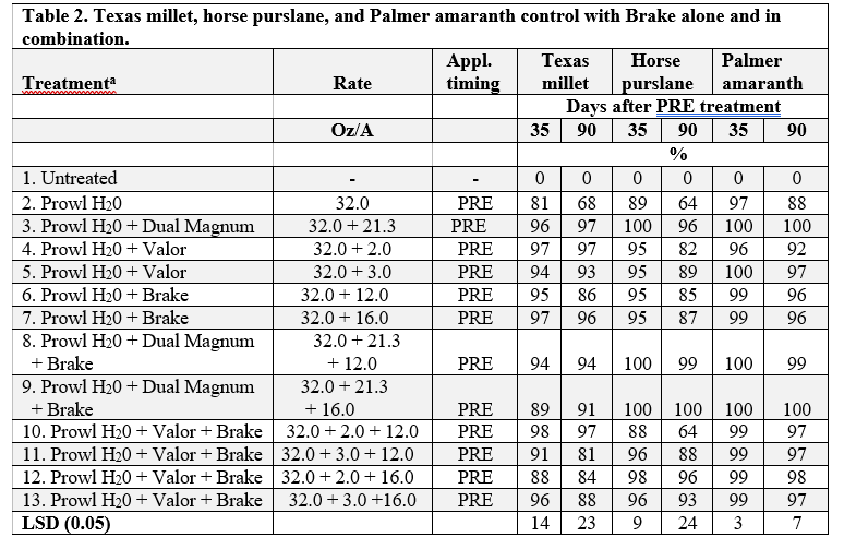 Palmer amaranth. At the 35 DAT evaluation, all herbicide systems including Prowl H2O alone controlled Palmer amaranth > 96% (Table 2). At the 90 DAP evaluation, herbicide systems which included Brake controlled Palmer amaranth > 96% while Prowl H2O + Dual Magnum controlled this weed 100%. Only Prowl H2O applied alone controlled Palmer amaranth less than any of the Brake systems.