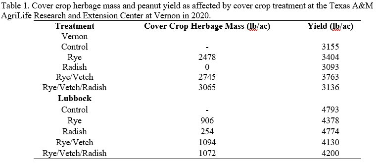 Trials were conducted at the Texas A&M AgriLife Research and Extension Center at Vernon on a Miles sandy loam soil. And the Texas A&M AgriLife Research and Extension Center at Lubbock on an Olton clay loam soil. Due to rotation, studies conducted in 2023 were completed under pivot irrigation at Vernon and furrow irrigation at Lubbock. The site at Vernon had been under no-till wheat from 2001-2018 until ground was tilled for peanut work in 2019. Peanuts were planted in 2023 following cotton at each location. After cotton harvest in 2022, cover crops were planted using a no-till drill in a complete randomized black design with four replications. Cover crop treatments included 1) control (no cover crop); 2) cereal rye planted at 30 lb/ac; 3) radish planted at 10 lb/ac; 4) Rye/hairy vetch mixture (25/5 lb/ac); and 5) rye/hairy vetch/radish (25/3/2 lb/ac). These same treatments were duplicated in Lubbock. In Vernon, cover crops were terminated on April 26 using glyphosate. A roller crimper was used to terminate cover crops, but was not a total success due to reduced residue levels. Peanuts (ACI 236) were planted on May 18th under no-till conditions at Vernon. This planting date was later than planned due to extensive tornado damage at the Center on May 4. Due to lack of power to the pivot, peanuts were planted under drier conditions than ideal. Cover crop herbage mass and plant stands after emergence were quantified. Measurements were taken for microbial biomass and community analysis, soil carbon, soil nutrients, soil moisture, and GHG emissions. Prior to termination, plots were clipped to determine cover crop herbage mass production. Peanuts were dug in Vernon on October 13. After digging, rainfall events became an issue and prevented harvesting until November 16. Many of the peanuts at Vernon had mold damage and were not suitable for grading.