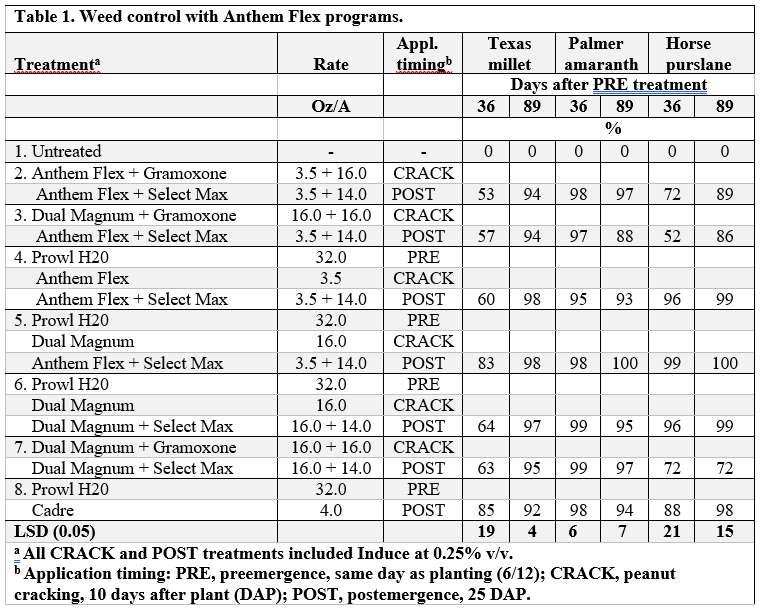Coloradograss (Texas millet). When evaluated 36 days after PRE treatment (DAT) any herbicide system which included Prowl H2O applied PRE provided 60 to 85% control while systems that included Anthem Flex applied at CRACK and POST provided 53 to 57% control (Table 1). The Dual Magnum only treatment controlled Texas millet 93%. At the 89 DAT evaluation, all herbicide systems controlled Texas millet > 92%. All systems, except Prowl H20 followed by Cadre applied POST, contained Select at 14.0 oz/A applied POST and this helped improved control millet control. Typically Anthem Flex alone will not control Texas millet season-long and will need a herbicide such as Select to provide control of annual grass escapes.