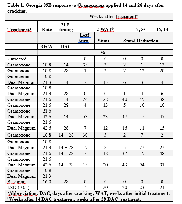 Soils at the Yoakum study site was a Tremona loamy fine sand with pH of 7.6. Plot size was 2 rows (38” spacing) by 30’ long. Spray applications were made with a CO2-pressurized backpack sprayer with a handheld boom equipped with TeeJet DG 11002 spray nozzles calibrated to deliver a total spray volume of 20 gal/A. Georgia 09B was planted on June 12. Gramoxone was applied at 10.8 fl oz/A (1X) and 21.6 fl oz/A (2X) at two different timings, 14 days after cracking (DAC) and 28 DAC. Dual Magnum was also added to some Gramoxone mixes and Gramoxone + Dual Magnum + Basagran was the standard. Sprinkler irrigation was applied as needed. Rainfall events after planting were 0.57 inch on June 21, 0.48 inch for July, and 0.34 inch for August.