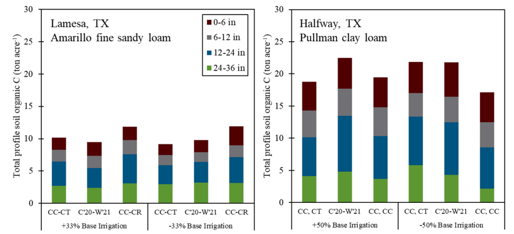 Figure 2. Total profile soil organic C to a 36-inch depth at the Lamesa and Halfway, TX, research sites established in 2014 and 2013, respectively. CC-CT denotes continuous cotton using conventional tillage; C’20-W’21 denotes a cotton-wheat-fallow system using no-tillage; and, CC-CR (or CC) denotes continuous cotton using a winter cover crop and no-tillage. Figure designed by Dr. Joseph Burke, 2022.