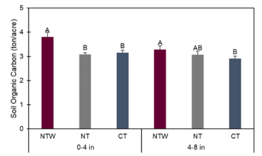 Figure 3. Cover crop and tillage impacts on SOC (ton/A) at 0-4” and 4-8” depths. NTW denotes no-till with a winter wheat cover crop; NT denotes no-till without a cover crop; and, CT denotes conventional tillage and winter fallow. Figure designed by Dr. Mark McDonald, 2021.