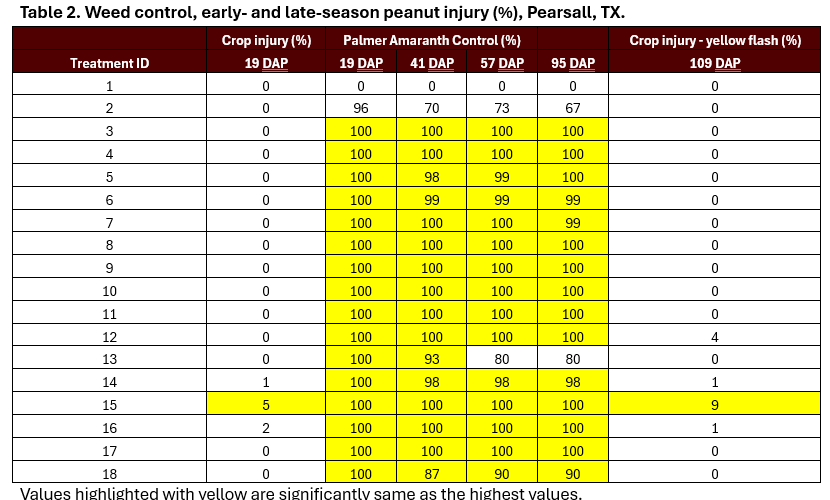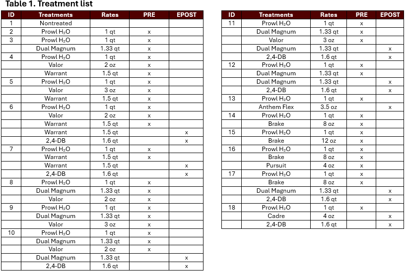 A field study was conducted in 2024 in an irrigated peanut field near Pearsall, TX. Soil at the study site was a Duval very fine sandy loam. The trial included eighteen treatments and was arranged as a randomized complete block with three replications. Plots were two rows (38” spacing) wide by 30 ft long. The field was planted to Georgia 09B peanut on June 6, 2024. Preemergence (PRE) treatments were made two days later on June 8, 2024. Early postemergence (EPOST) applications were made on July 17, 2024, 39 days after PRE applications were made. Applications were made with a CO2 pressurized backpack sprayer with a handheld spray boom equipped with TeeJet Drift Guard 11002 spray nozzles calibrated to deliver a total spray volume of 20 (PRE) or 15 (EPOST) GPA.