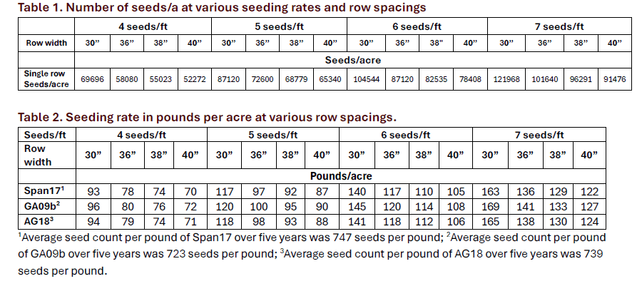 Table 2 lists the average seed counts/lb for common peanut varieties. Seed size varies significantly by market type (e.g., Runner, Spanish, Virginia, and Valencia), varieties, and specific seed lot. For example, seed count/lb of Span17, GA09b, and AG18 are approximately 747, 723, and 739 seeds/lb, respectively. However, because these numbers fluctuate between seed lots, always refer to the seed tag on the bag for the most accurate data. Use the specific count listed on the tag to calculate the pound/acre required for your row spacing.